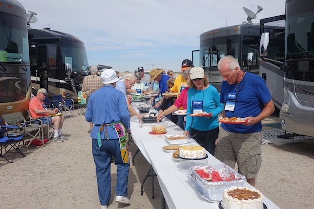 Our four hosts organized a shrimp boil where they provided the great (and large) local shrimp and the rest of us brought salads or deserts. A long line of portable camping tables was extended with a white plastic table cloth (fully anticipated by our hosts) which was stretched over 25 feet and bedecked with a great selection of homemade and, in a few cases, home (in-rig) baked items.