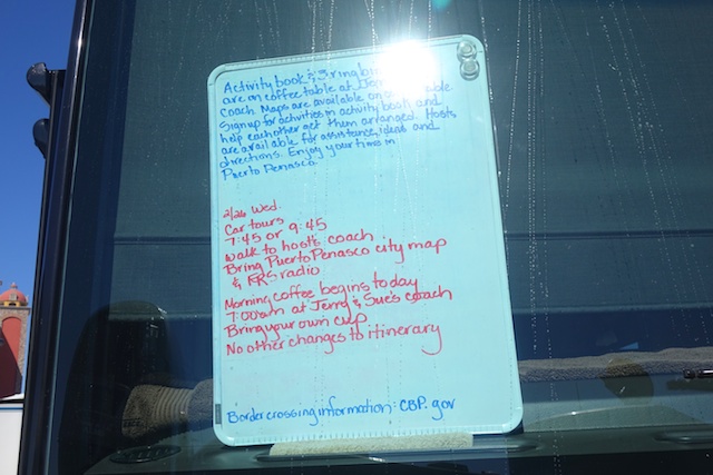 Outside of our host's Liz and Doug's coach were two three-ringed binders. One held sign-up/meet-up sheets for people interested in deep sea fishing, golf, sand dollar hunting and other similar activities. The other binder was a collection of menus, brochures, and information on Puerto Penasco. In the front window of their coach, there was a white board with messages and updates. A big commercial coffee urn was set up each morning to dispense a cup of joe for the early birds.