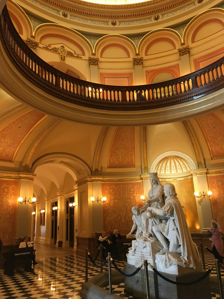 In the center of the rotunda sits a surprising classical statue of Queen Isabella of Spain giving Columbus his travel assignment. A state-paid docent happily explained the origin of the statue (short form: it was a thank you gift from a generous businessman) and answered some of our other questions like, "where's the Governor's office?"
