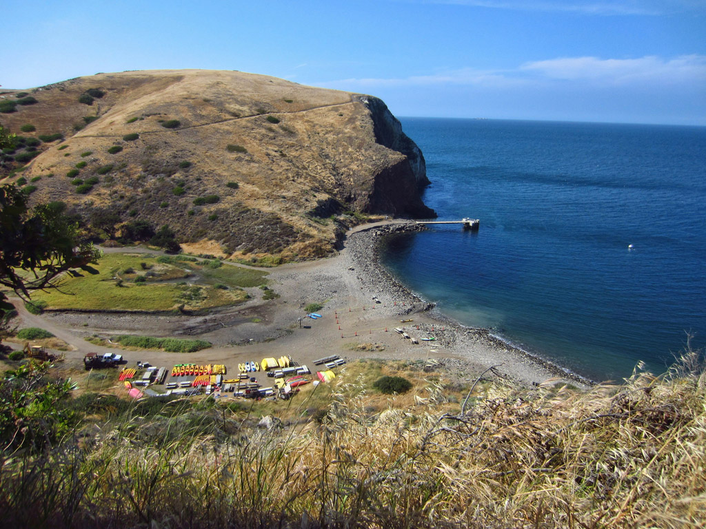 The pier at Scorpion Cove washed away in a storm with high surf last December, making it now necessary to come ashore via skiff, or small rubber boat. That includes bringing all camping gear ashore, which must then be unloaded "daisy chain" style.