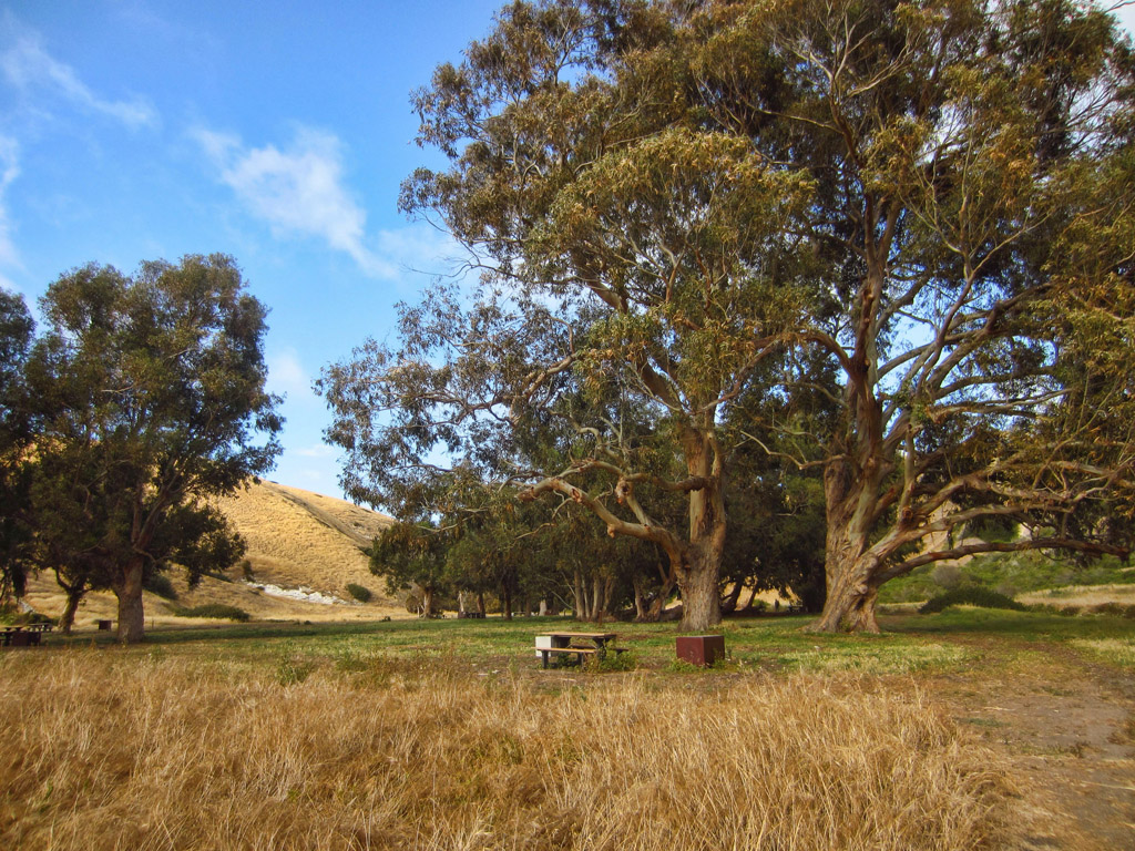 By the time I get all my gear loaded on me like a pack mule and begin the half-mile hike to my designated campsite, I realize I am at the furthest end of the loop. My site is at the bottom of a V-notch in the surrounding hills, which serve as a funnel to channel the stiff wind right down on me. Whereas all the other campsites are surrounded by giant, fragrant eucalyptus trees and therefore somewhat protected from the wind, my site is exposed with no shelter. Yes, I brought layers, but I am wearing all of them and still freezing due to the wind!