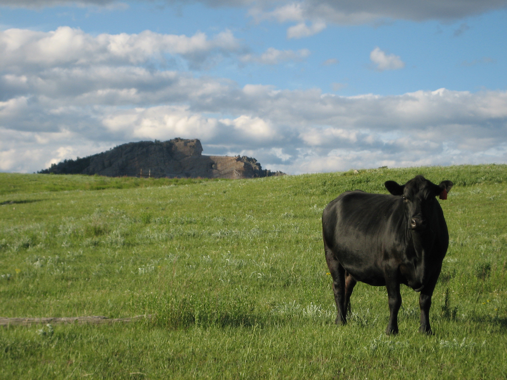 Black cow staring straight at the camera in grassy field with Crazy Horse monument in the background.Still life with cow. In the distance you can see the outline of Chief Crazy Horse's head start to take shape.