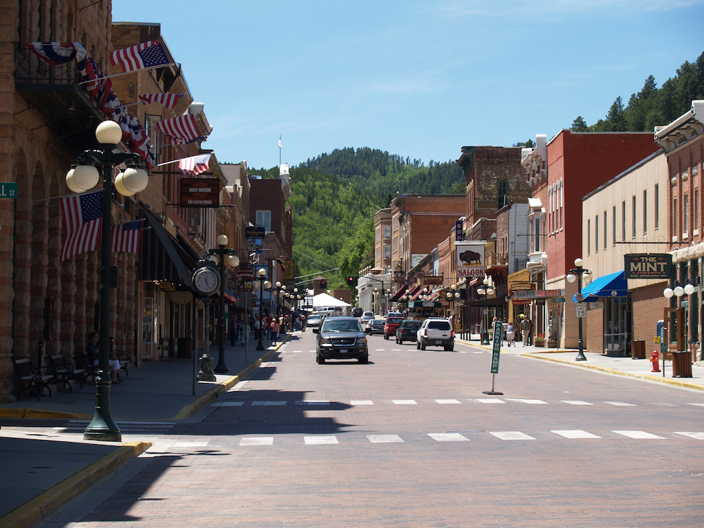 Cars driving down the street in downtown Deadwood.Deadwood is at the north end of the trail.