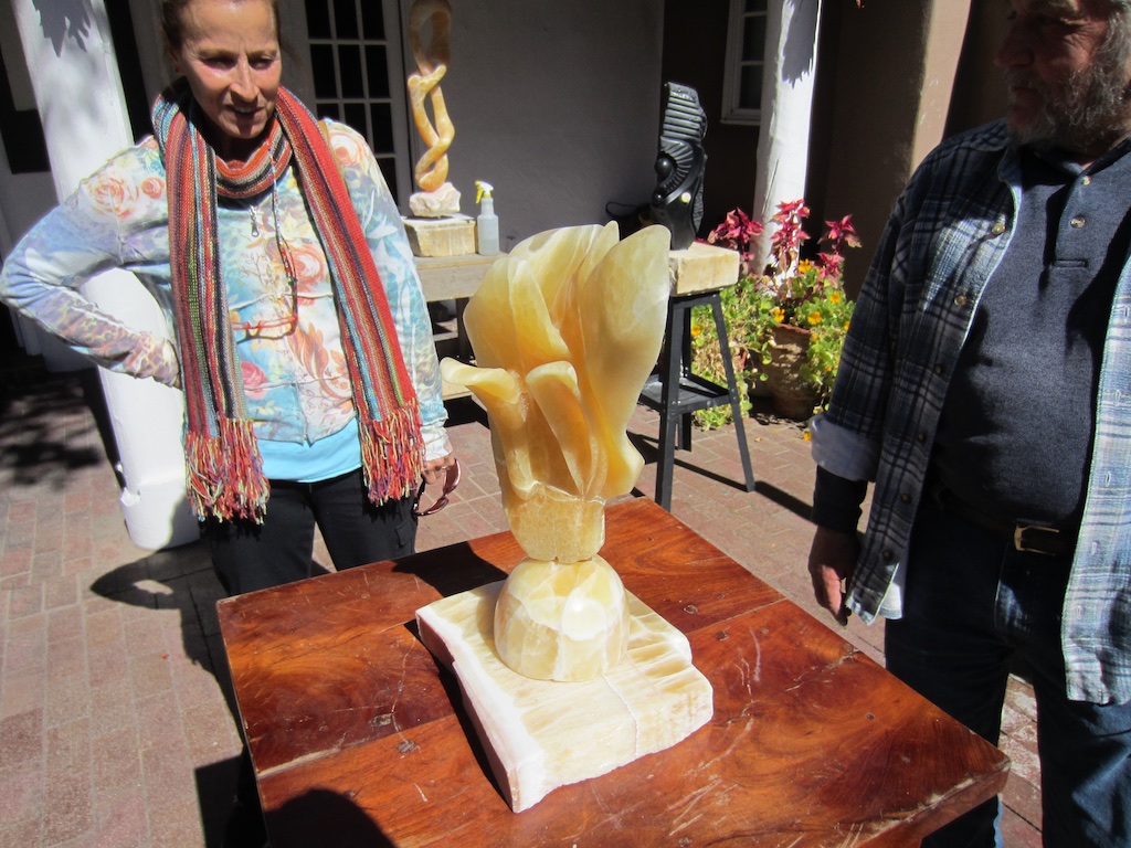 Terry standing at a table with alabaster sculpture on it and the artist standing there as well.Terry admires an alabaster sculpture as the artist explains his delicate carving technique.