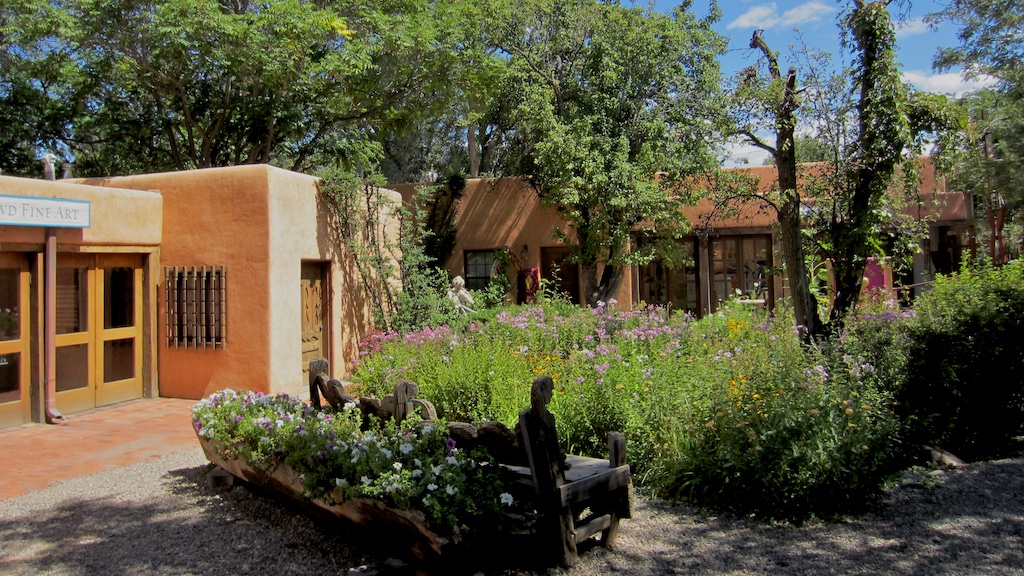 Bench among beautiful garden area of Santa Fe Canyon Road Gallery.A gallery and gardens off of Canyon Road.