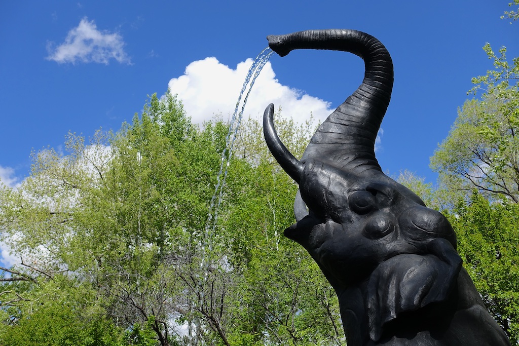 Water pouring out of the trunk of an elephant sculpture in the garden.Whimsy and majesty at the delightful outdoor garden at Nedra Matteccuci Galleries.