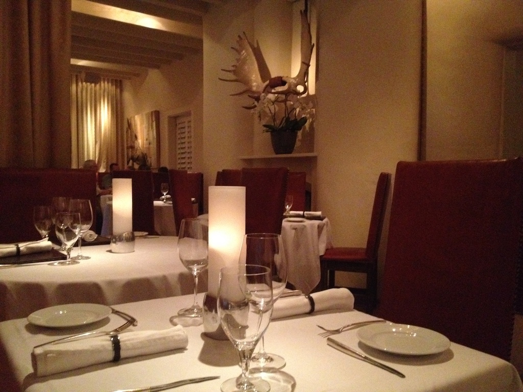 Skirted tables with candles lit in fancy restaurant.Awaiting a meal of culinary artistry our table at Geronimo is ready.