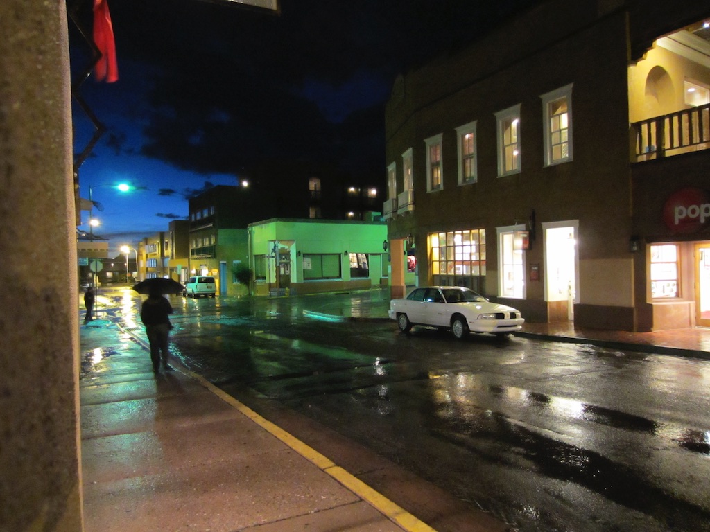 Wet streets of Santa Fe at night.The Santa Fe streets are washed clean outside of the Coyote Cafe by a brief evening thunderstorm.