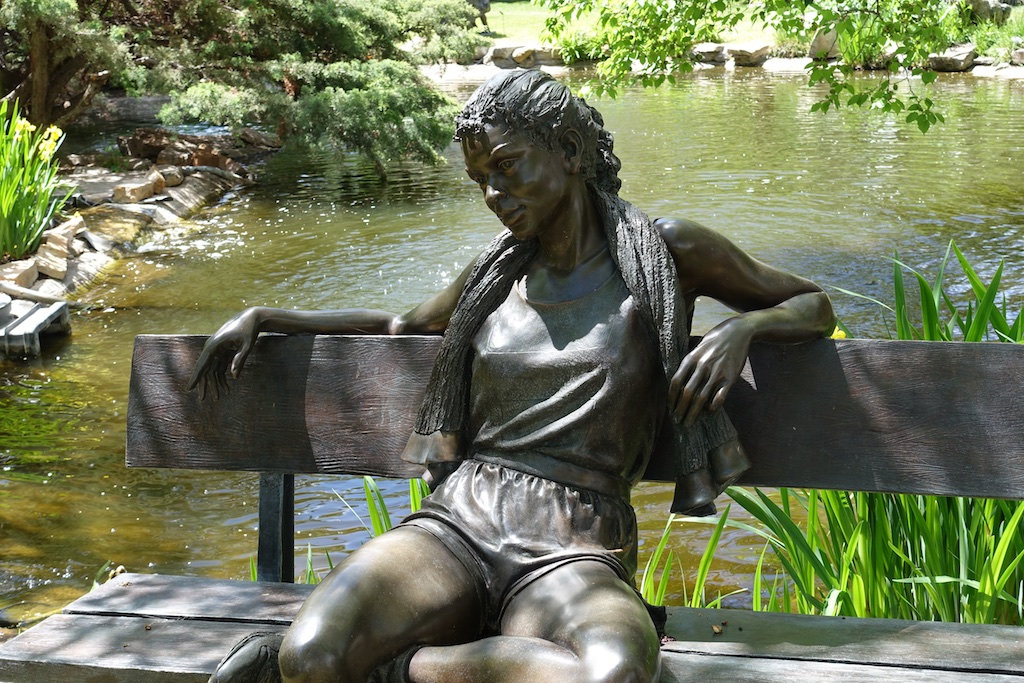 Sculpture of a woman sitting on a park bench with a pond behind.Sculptor George Lundeen's "Nike Girl" in the Nedra Matteucci Galleries garden.