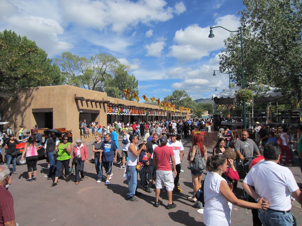 People crowded along the street of Santa Fe Plaza.Even with high end boutique stores around the main plaza you can still buy native art displayed on sheets under the cover of the Palace of the Governors.