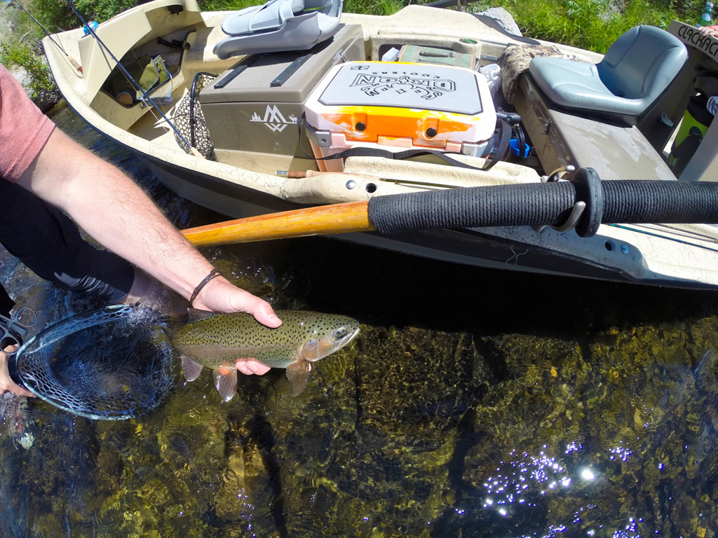 Fishing was slow by Madison standards, but as the sun came out and the day warmed, we didn't care. The float was beautiful, with snow capped mountains in the distance, clear water, and a few trout coming to hand. Tripper napped, or assumed the ever-ready gunnel surfing pose, ready to lend a paw with any unruly trout.