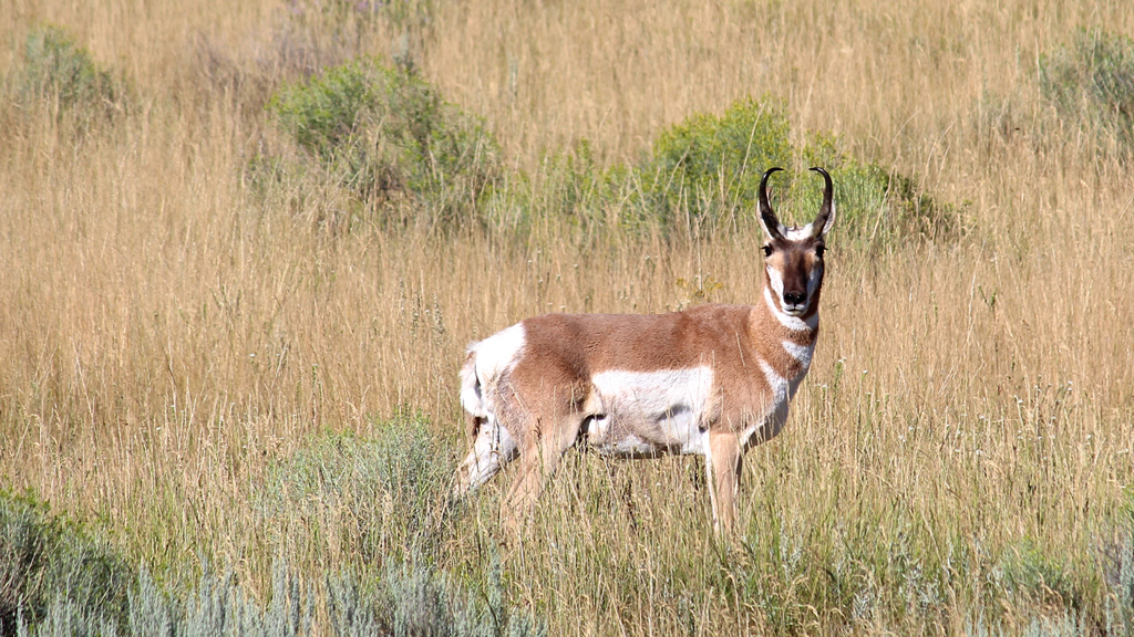 By the evening, we were off the river, and continuing our way South. Destination for the evening, another BLM campground at Cliff and Wade Lakes. On our way in, we passed a few pronghorn antelope -- a lone buck at one point, and then a buck rounding up his does.