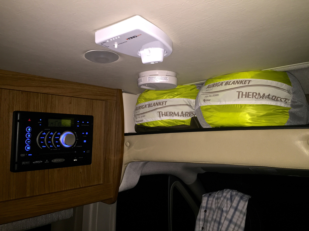 We've really fallen in love with the Auriga down blankets from Therm-a-rest. Think of them as half of a down sleeping bag -- they are basically meant to be used alone like a down comforter, or they can be paired with an inflatable Therm-a-rest sleeping pad, and used in your tent on the trail, utilizing the pad to insulate your back. They are very warm, highly compressible, light, and keep us warm in a variety of conditions. We keep them stored in the Travato overhead storage bin, or just leave them on the bed when we fold it up. Weighing just over a pound, they then serve double duty if we camp a night away from the Travato, easily packing into backpacks, preventing us from needing to store extra sleeping bags to take with us on the trail. As an active, tossing sleeper, I can still move around a lot just like I would at home or in the Travato. Tripper loves to call them home too.